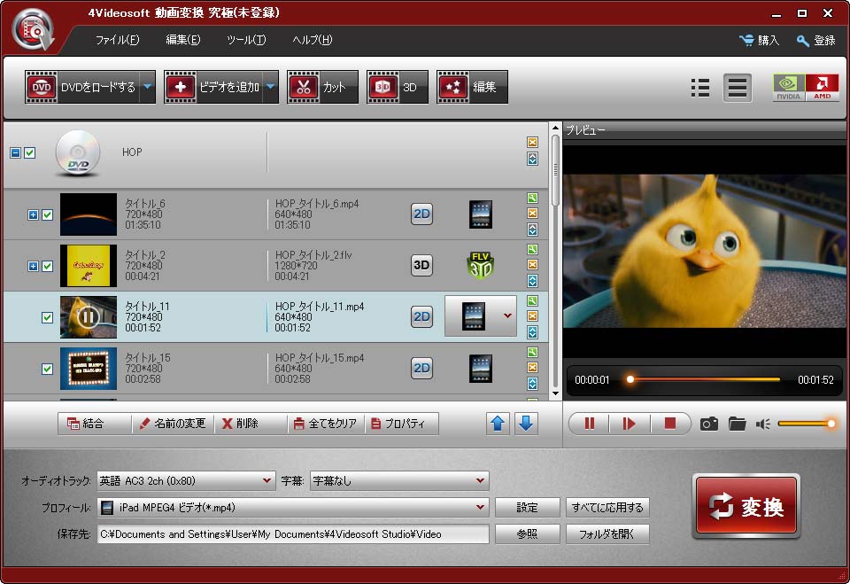 4Videosoft 動画変換 究極は最高な動画変換とDVDリッピングの両方を同時に実現させる究極な動画変換ソフトで、DVDを流行っている動画と音声形式にリッピングできる上に、任意の動画形式、更にHDビデオの間で、相互的に変換できます。そして、様々なDVDと動画ファイルから音声のみを抽出して、MP3、MP2、AAC、AC3、WAV、WMA、M4A、OGGなどの音声形式の間で高品質で変換できます。